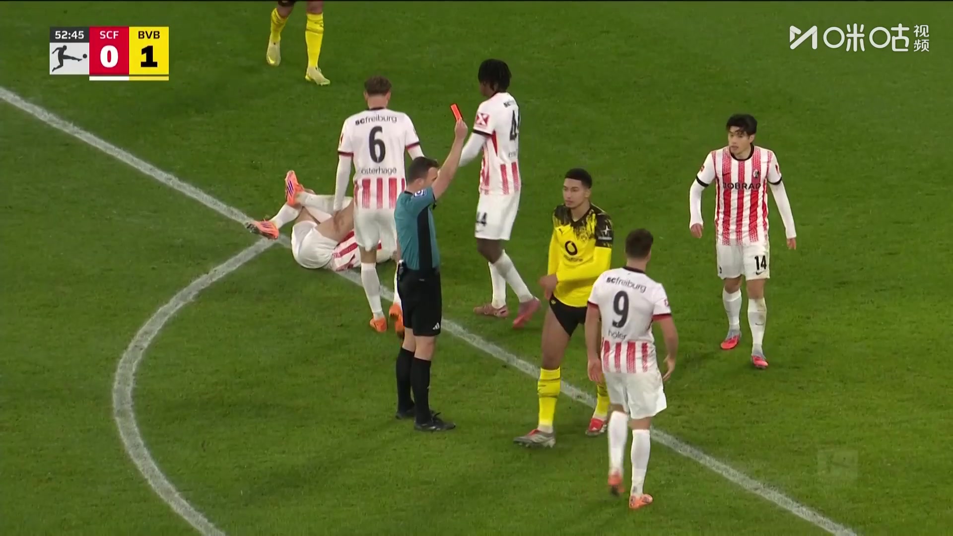 多特少打一人!小贝林厄姆背后放倒对手被直红罚下!